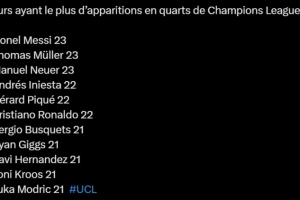 欧冠1/4决赛出场数:梅西、穆勒、诺伊尔23次并列第一,C罗22次